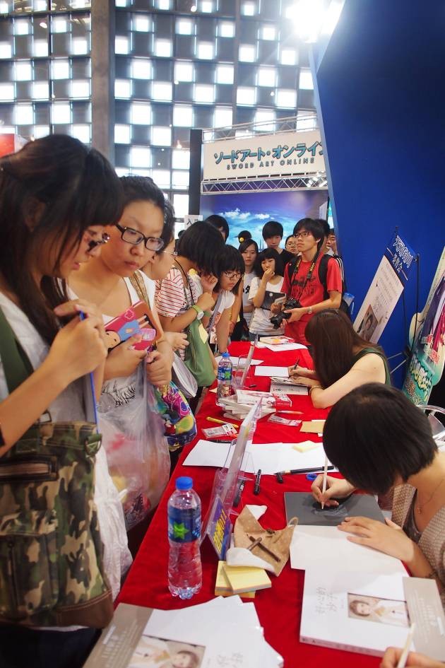 相比三年前首次亮相中國國際動漫游戲博覽會,向讀者們推出的僅是輕小說圖書,發展至今的天聞角川已經實現了系列書籍的規模化、作品類型與題材的多樣化。除引進優秀作品外,天聞角川還致力于在原創輕小說、漫畫、繪本、畫集、雜志等方面不斷推出精品暢銷書,如Buddy創作的漫畫《初·末ONCE AGAIN》、昔酒011創作的繪本《好心的沙子》、呀呀創作的畫集《花·女詞》等,都是優秀的原創作品,均將在本場展會亮相。天聞角川在一百多平米的展位里,以精心的布置和擺放,向讀者展示了近800種的圖書。專門針對本場展會特別首發的人氣圖書《刀劍神域11》和《KEI畫集 mikucolor》,以及今年首度推出的“輕文學”“天驕書坊”新書系,在開展第一天就被讀者一搶而空,工作人員又緊急安排補貨。天聞角川向大家呈現動漫圖書的王國,讓讀者盛夏暢游書海,快樂充實!
