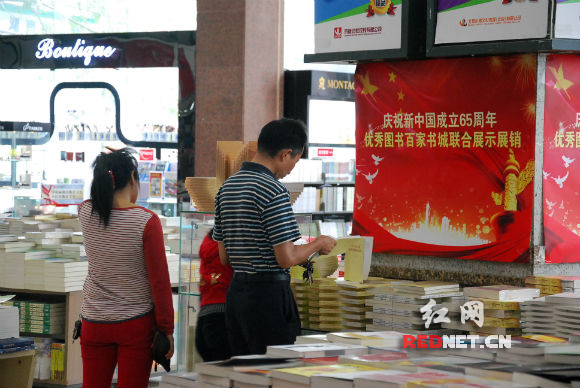 在湖南圖書城、邵陽(yáng)湘中圖書城,門口懸掛著“慶祝新中國(guó)成立65周年優(yōu)秀圖書百家書城聯(lián)合展示展銷活動(dòng)”的橫幅,進(jìn)門最顯眼處就是集中展示《之江新語(yǔ)》、《改革熱點(diǎn)面對(duì)面》、《鄧小平》等上百種優(yōu)秀圖書的專區(qū)。兩家書城都在國(guó)慶期間延長(zhǎng)營(yíng)業(yè)時(shí)間,并對(duì)讀者購(gòu)書提供優(yōu)惠活動(dòng)。