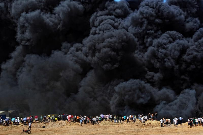 2013年7月2日,長沙瀏陽河黃興大橋附近,兩個復合地板倉庫起火,火勢借著風勢蔓延,冒出的滾滾黑煙,幾乎全城都看得到。華劍回憶,當天他剛好從瀏陽出差回來,經(jīng)過高速收費站時看到遠處濃煙漫天。憑著職業(yè)敏感,他第一時間趕到現(xiàn)場,拍下了這張圖片。