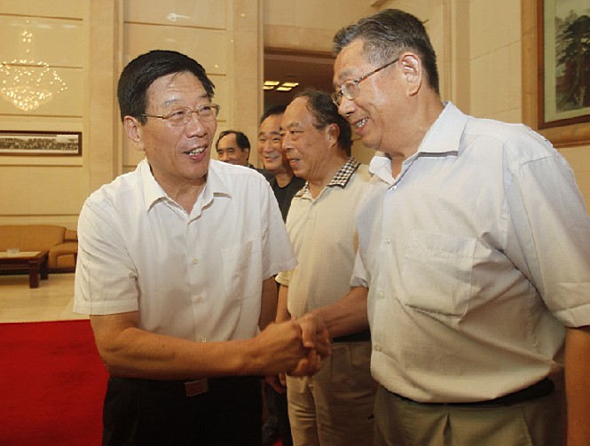 《湖湘文庫》編輯出版領導小組顧問徐守盛(左一)與編委會成員握手。