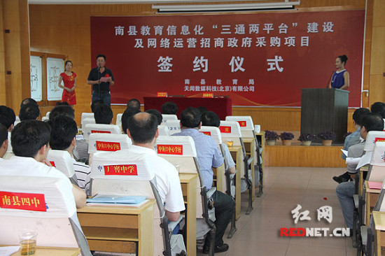 6月4日,湖南益陽市南縣教育局大會(huì)議室座無虛席,南縣教育局與天聞數(shù)媒科技(北京)有限公司就教育信息化“三通兩平臺(tái)”建設(shè)及網(wǎng)絡(luò)運(yùn)營簽訂了合作協(xié)議。根據(jù)協(xié)議,天聞數(shù)媒科技(北京)有限公司在合約簽訂后的90個(gè)工作日內(nèi)為南縣所有學(xué)校建成“三通兩平臺(tái)”,標(biāo)志著南縣教育信息化即將跨入“高速時(shí)代”。