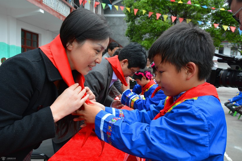 孩子們為愛心人士系上紅領巾。