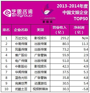 近日,由藝恩主辦的“紫勛之夜”頒獎(jiǎng)盛典在京開(kāi)幕。頒獎(jiǎng)典禮現(xiàn)場(chǎng)發(fā)布了2013-2014年度中國(guó)文娛企業(yè)50強(qiáng)榜單。
