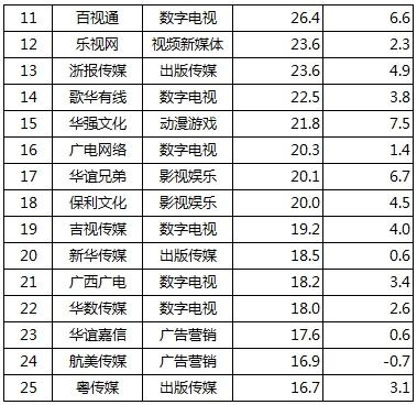 本次評(píng)選出的50強(qiáng)企業(yè)涵蓋影視娛樂(lè)、出版?zhèn)髅健⒁曨l新媒體、廣告營(yíng)銷(xiāo)、動(dòng)漫游戲和數(shù)字電視六大類(lèi)別,中南傳媒位居總榜第二位、出版?zhèn)髅郊?xì)分領(lǐng)域第一位。在其他細(xì)分領(lǐng)域,萬(wàn)達(dá)文化、省廣股份、完美世界、優(yōu)酷土豆、百視通分別位居影視娛樂(lè)、視頻新媒體、廣告營(yíng)銷(xiāo)、動(dòng)漫游戲和數(shù)字電視細(xì)分領(lǐng)域榜首。