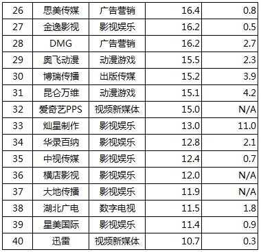 本次評選出的50強企業(yè)涵蓋影視娛樂、出版?zhèn)髅健⒁曨l新媒體、廣告營銷、動漫游戲和數(shù)字電視六大類別,中南傳媒位居總榜第二位、出版?zhèn)髅郊毞诸I域第一位。在其他細分領域,萬達文化、省廣股份、完美世界、優(yōu)酷土豆、百視通分別位居影視娛樂、視頻新媒體、廣告營銷、動漫游戲和數(shù)字電視細分領域榜首。