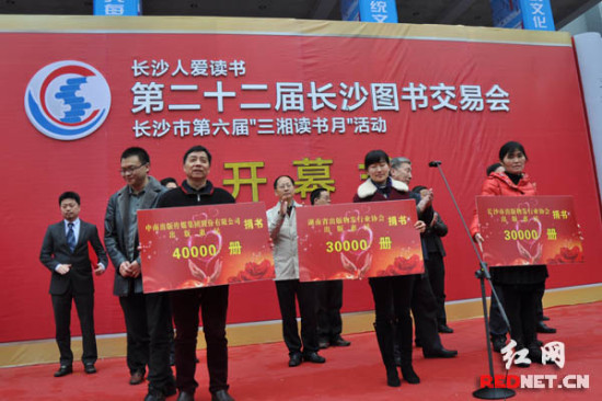 開幕儀式上,中南傳媒集團(tuán)股份有限公司、湖南省出版物發(fā)行業(yè)協(xié)會、長沙市出版物發(fā)行業(yè)協(xié)會向長沙市圖書館總分館、14家首批示范性農(nóng)家書屋和獲得全國“書香之家”稱號的書香家庭,捐贈了10萬冊圖書。2014年度長沙人最喜愛的10本書也同時揭曉,其中,《習(xí)近平談治國理政》、王躍文所著的《愛歷元年》等書成功入選。